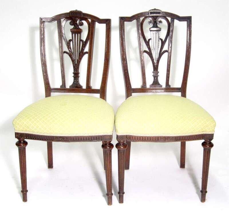Each with shaped shield back, carved with urn, leaves and heart form scrolls, upholstered seats and turned, tapering fluted legs.