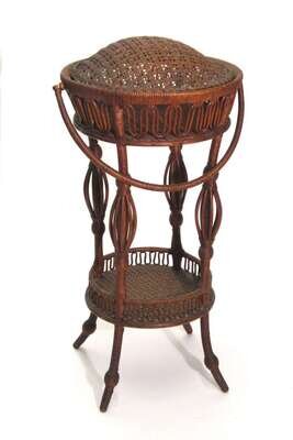 Of circular form with a domed lift lid and a swing handle on four legs above a galleried tier on four outswept legs, paper label to underside, "From F.L. Graves' South Side Furniture Rooms Harrington's Block 194 Moody Street, Waltham, Mass."