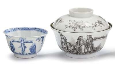The covered bowl decorated in grisaille with Biblical scene of Moses in the bullrushes, the lid with flowers, the teabowl decorated in blue with crucifixion.