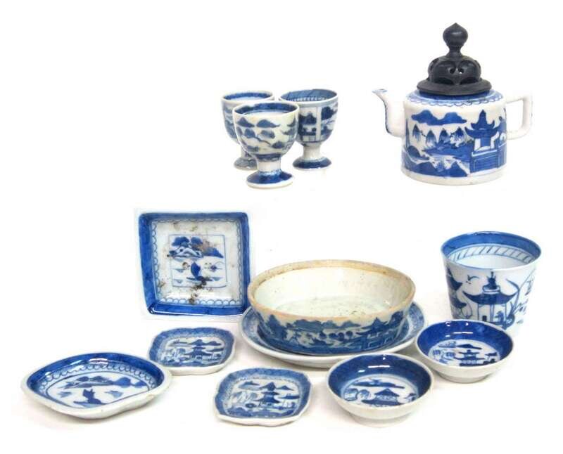 Including three egg cups, tumbler, two butter pats, small drum form teapot with wooden replacement lid, oval butter dish without lid and undertray and four small dishes of various sizes.