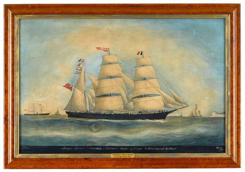 Signed, "J T. Dodge," dated, "Havre 1871" and titled, "Barque Theresa of Shoreham L.D. Smith Master off Cape Le Heve bound To Havre," watercolor and ink on paper, bird's-eye maple frame.
