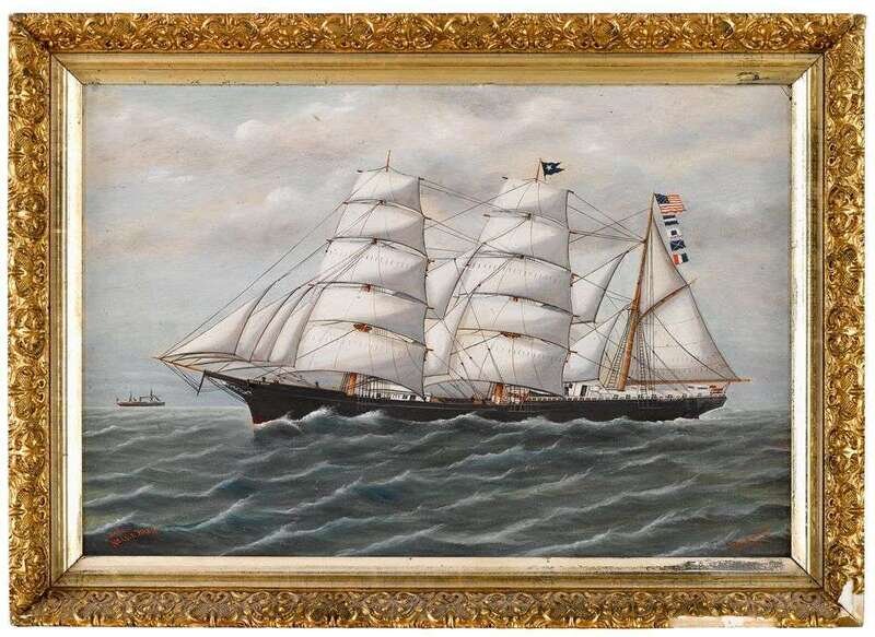 Identified and signed, "Barque Nellie Brett" and "Frank Barnes, Wellington NZ," oil on panel, framed.