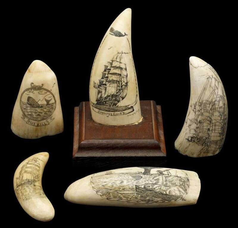 Five scrimshaw whale's teeth