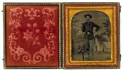 Sixth-plate with hand-coloring in a period, double-hooked case with embossed, patriotic motif with arched, brass mat. Full-view of standing soldier holding a rifle with fixed bayonet against contrived campground backdrop. A handwritten note pinned to the interior velvet reads, "A typical volunteer of '61."