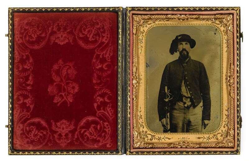 Quarter-plate in period, double-hooked, brown case with gilt border and embossed, flower motif with double-elliptical, embossed brass mat. The bearded Corporal wears a feathered, slouch hat and stands with his saber; his partially-open frock coat exposes his beltplate.