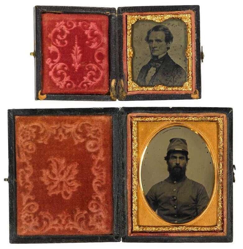 Ninth-plate ambrotype of Civil War, possibly Confederate, soldier in period, embossed case with oval brass mat; together with a sixteenth-plate tintype of Jefferson Davis in period, brown case. A paper card on the back of the image reads, "Jefferson Davis President Southern Confederacy"