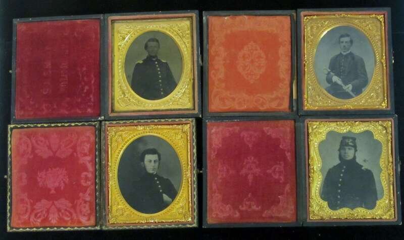 The first, depicting bearded infantry officer wearing kepi with hunting horn insignia and jacket with probable lieutenant bars in period, embossed case with nonpareil, embossed brass mat; the second, of seated officer with gilt accents in period, embossed case with oval, embossed brass mat and interior velvet stamped, "S.A. Smith Doylestownp"; the third and fourth, of seated officer holding sword and seated officer with hand tucked into coat, respectively; both in period, embossed cases with oval, embossed brass mats.