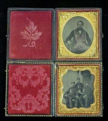 The first, a sixth-plate ambrotype with hand-coloring in period, embossed case with oval, embrossed brass mat. The bearded Mason, who wears his fraternal apron and other insignia, sits in a chair with his arm propped on a nearby table. The second, a sixth-plate tintype in double-hooked, embossed case with nonpareil, embossed brass mat depicts three gentlemen in frock coats with foreign/fraternal insignia.