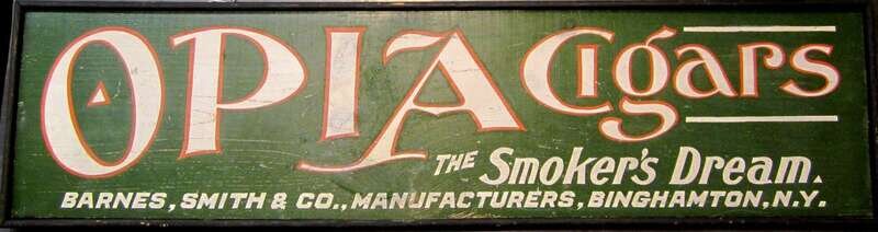 Rectangular framed sign painted green and inscribed, "Opia Cigars-The Smokers Dream. Barnes, Smith & Co Manufacturers, Binghamton, NY."
