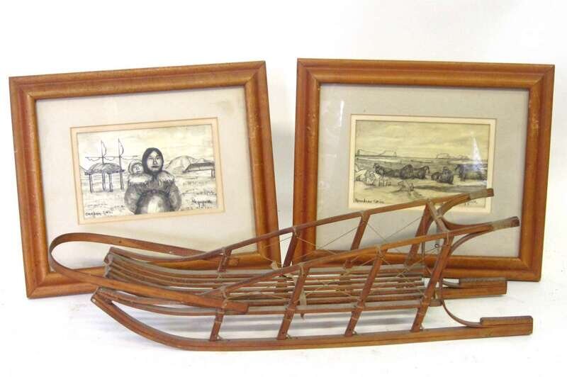 Each signed, "Ahqupuk," water and ink on reindeer and caribou skin, framed; together with a model of a dog sled.