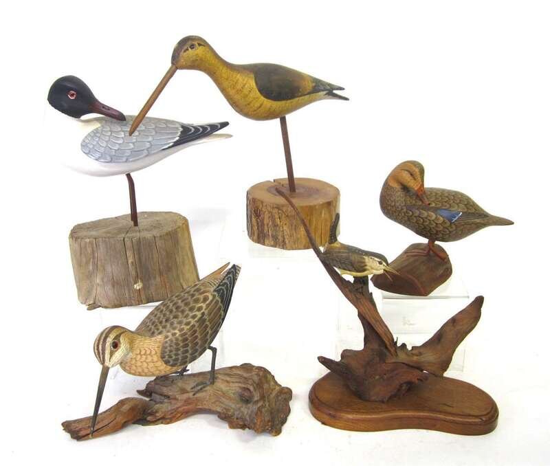 Including a seagull on a oval wood plinth, mallard hen on a wood plinth, and a sandpiper on driftwood, all signed "H.V. Shourds" and dated; together with a sandpiper on a circular wooden plinth with an attached paper note, "painted by Danny Silva Chatham, Mass," and a warbler on a branch mounted on a piece of driftwood on a shaped base, signed "F.J. Delia May 1, 1977."