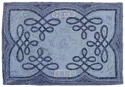 Rectangular form worked in many shades of blue with looping devices and the word, "Echo," on a burlap ground.