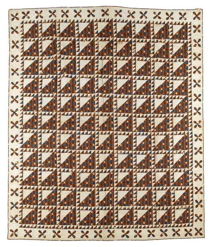 A border of four petal flowerheads encloses a field of triangles of various sizes pieced in a printed cotton fabric of blue, browns, beige and red, and heightened with conforming and oval quilting.