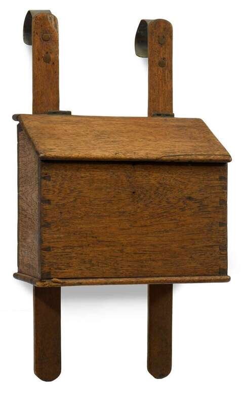 Dovetailed box with hinged slant lid hands from vertical posts with copper strap hooks at ends.