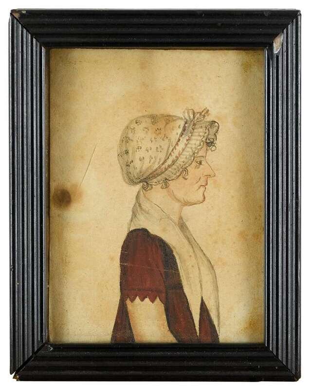 American School 19th century miniature half-length portrait of a lady in a bonnet