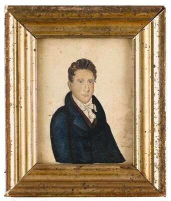 American School 19th century miniature portrait of a gentleman in a blue coat