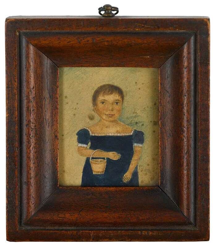 American School 19th century miniature portrait of a little girl with a basket