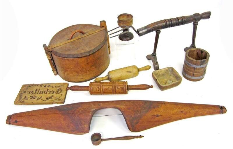 Including a chip carved cookie roller with animals, fruits, flowers and buildings; a rolling pin; a square-shaped mold primitively carved with an "X"; a turned goblet; six-part butter mold; small turned ladle; a carved shoulder yoke; a circular covered box with locking mechanism; and a hearth toaster with four pronged fork.