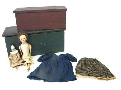 Two painted boxes with two dolls and doll clothing 19th century