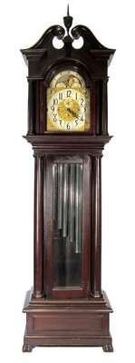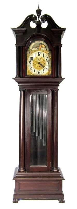 Double scroll cresting with rosettes, arched face door flanked by turned columnettes, brass face displaying the phases of the moon, black on silver Arabic numeral chapter ring, Westminster, Wittington and St. Michael's chimes, glass waist door flanked by turned columns, low base panel on claw carved feet.