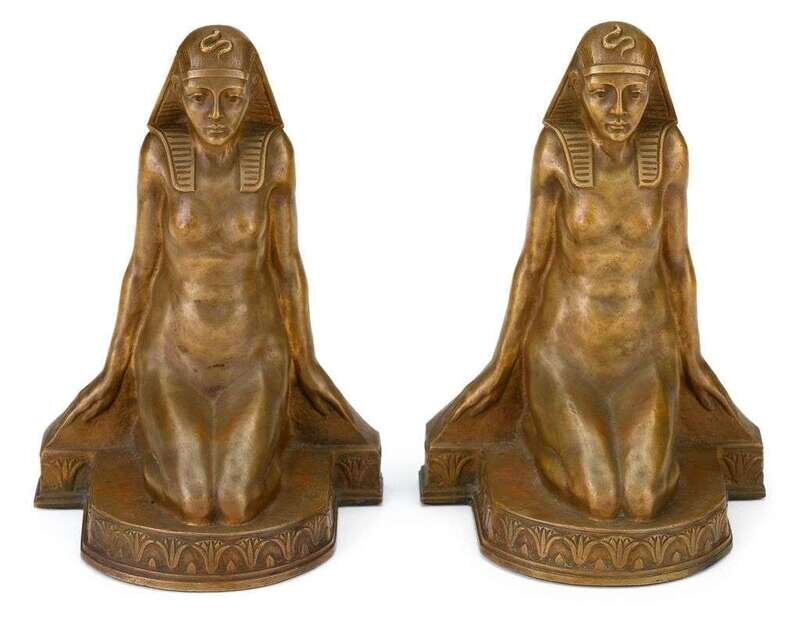Pair of Egyptian Revival bronze book ends griffoul, newark, nj, early 20th century