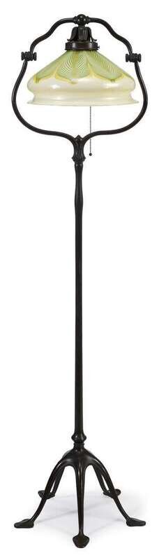 Having a favrile green and yellow feather domical shade with a flared rim, marked "LCT," enclosed in a harp with a swivel socket on a tapering bronze verdigris standard with five arched legs and spade feet, stamped "Tiffany Studios New York 423 H."
