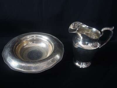 Circular serpentine everted rim, gadroon edge with wide garland engraved rim, circular foot; together with a sterling silver water pitcher, plain urn form with "C" handle, circular base. .