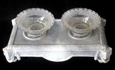 Rectangular shape fitted with two wells on garland and squat urn feet ,all over crackle glaze, fitted with two recessed glass holders from a different source.