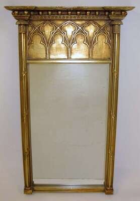 The reverse breakfront top over gothic style frieze, above a rectangular mirror plate flanked by fluted supports.