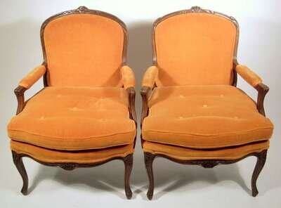 Carved shaped crest, over padded elbow rest, above loose cushion, raised on cabriole legs.