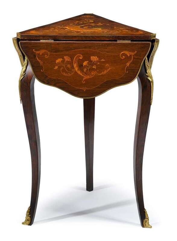 The triangular top with three drop leaves and bound edge, with marquetry depicting c-srolls and foliage to the top and leaves, on three tall square cabriole legs, with bronze mounts at the knees, terminating in cast sabots.