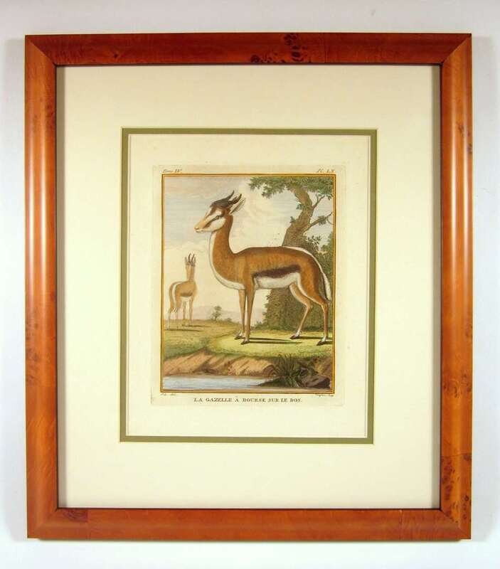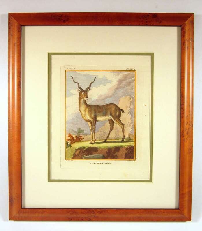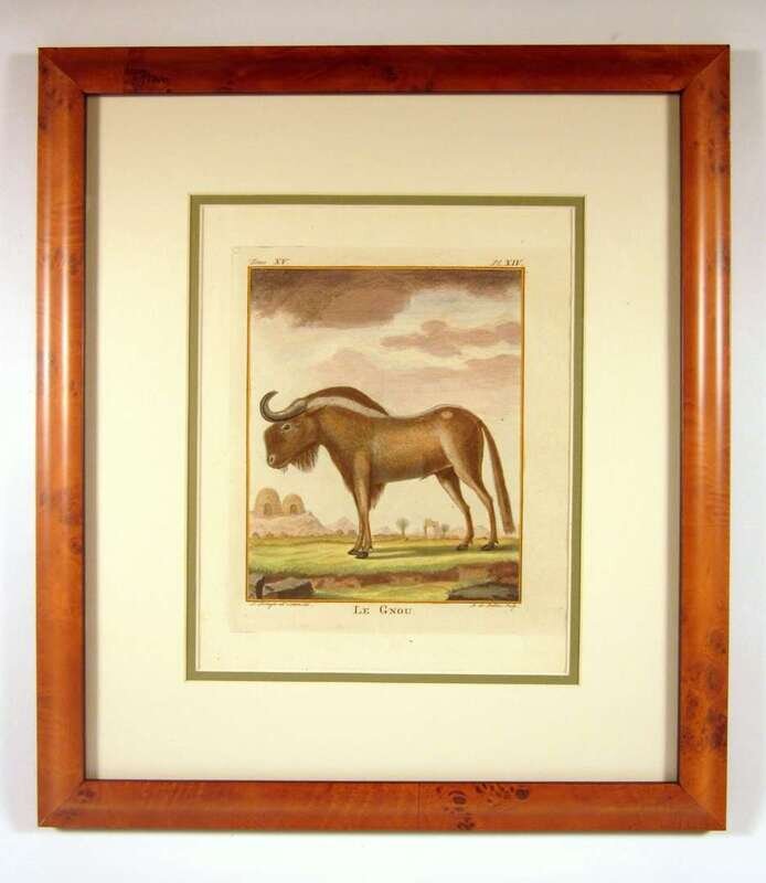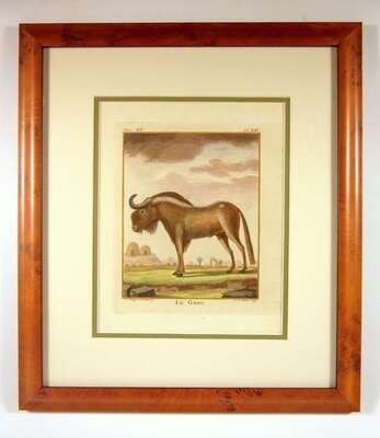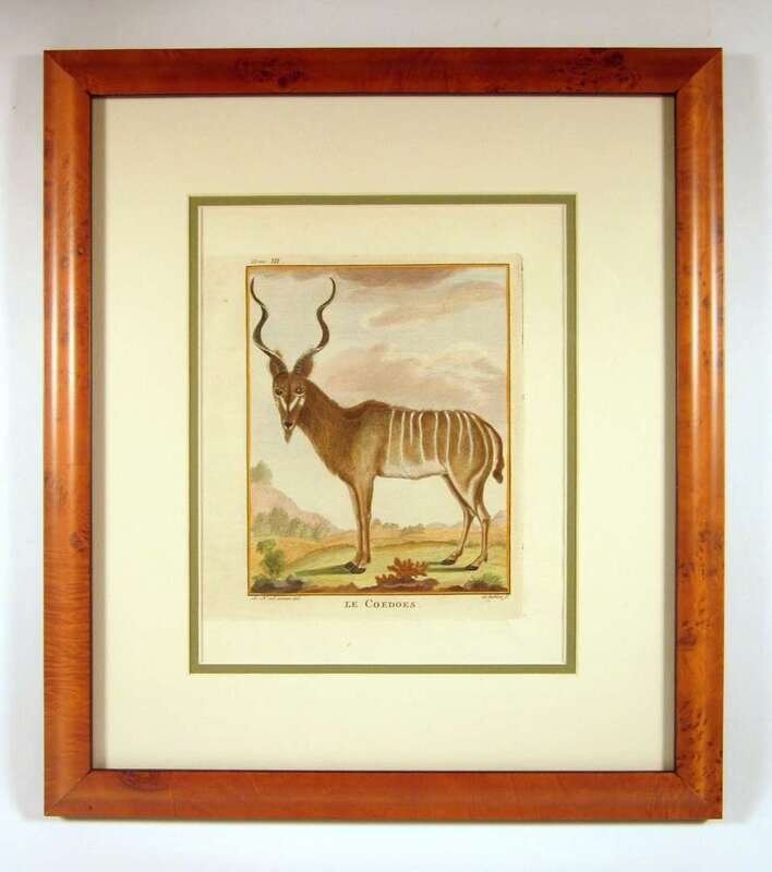 Comprising 'la gazelle a bourse sur le dos', 'l'antilope male', 'le gnou', and 'le coedoes'. Framed, matted and glazed.