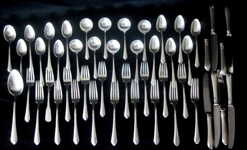 "Lady Diana" pattern comprising nine dinner forks, nine salad forks, eight hollow handle dinner knives, twelve teaspoons, eight cream soup spoons, one sugar spoon, and one serving spoon, monogram.