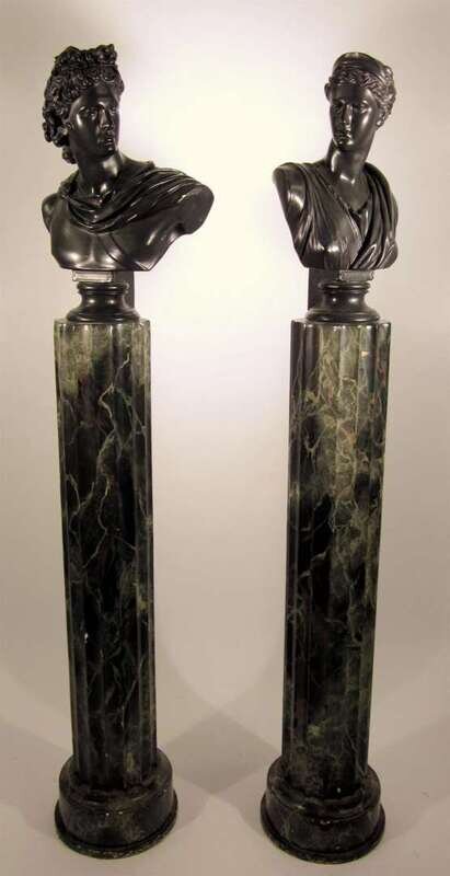 After the Antique, a pair of black plaster busts on faux verde antico marble columns