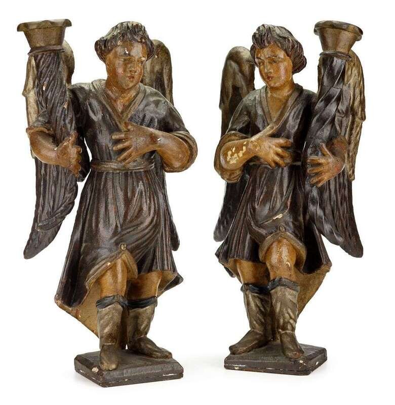 Mirror carved winged archangels grasping torches raised on square plinths, iron mounts verso.