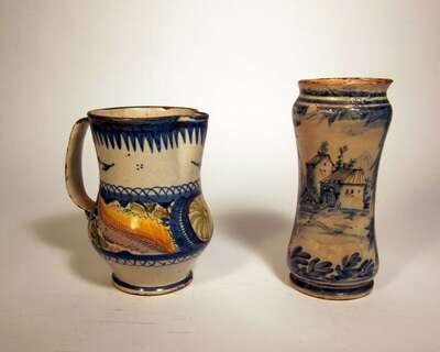 Typical waisted cylindrical form, underglazed to show farm buildings, together with a majolica jug. (2).