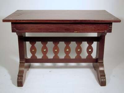 The rectangular top inlaid at the corners, raised on shaped supports united by galleried stretcher.