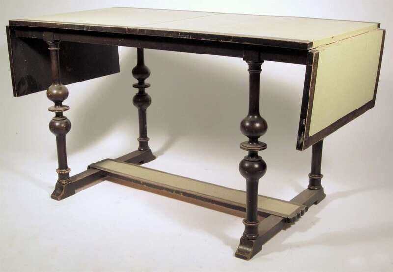 The eggshell and black painted top with drop down sides, over turned legs united by stretchers.