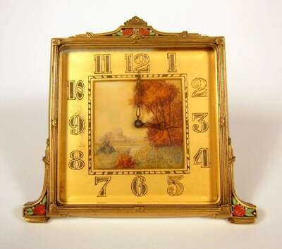 Square easel case, floral enamel decorated crest and feet, square gilt dial with black Arabic numerals, the center with a miniature painting of a landscape with stream.