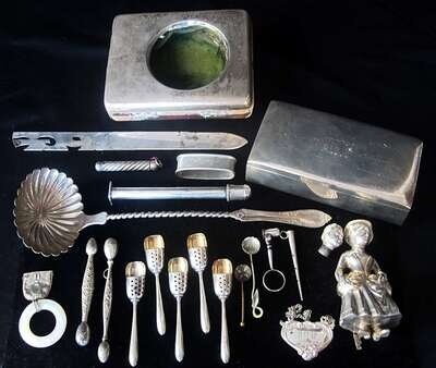 Including letter opener, spiral pencil, ladle, napkin ring, figural pepper shaker with extra "head," rattle, toothpick holder, box, frame, punch ladle and pierced conical top.