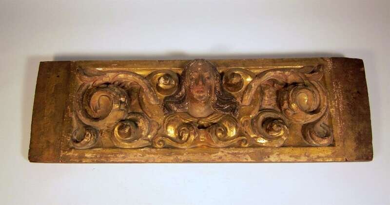 Carved to the center to depict a female saint, surrounded by swirls.