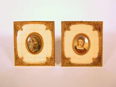 Oval potraits, one depicting the Virgin and Child, the other a female saint, both indistinctly signed and mounted with in faux ivory surrounds, within gilt metal frames. (2).