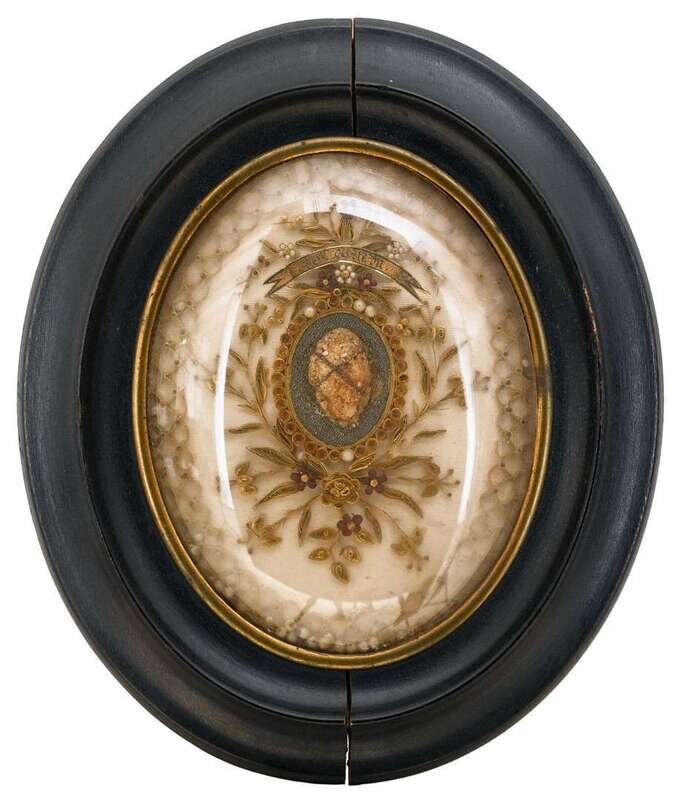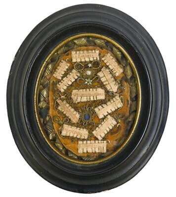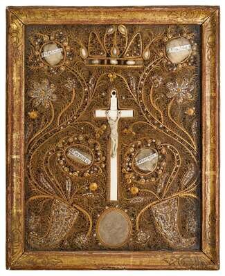 The first centered by an ivory crucifix and surrounded by four stones, each labelled "S. Placide", "S. Fidelison", "S. Coronata", and "S. Severioni m" surrounded by ornate gilt scrolls and beadwork; the second with a central relic piece within cartouche surrounded by foliate rolled paper scrollwork and beads within a similarly worked border; the last with eleven fabric-wrapped reliquary pieces within gilt metal coils. (3).