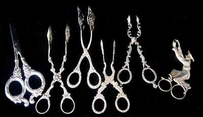 Four scissor style, one figural; together with silver handled grape shears.