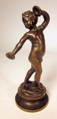 Bronze, mid brown patina, cast to show the bacchic boy dancing with cymbals, on a naturalistic base signed 'Clodion", raised on bronze socle.
