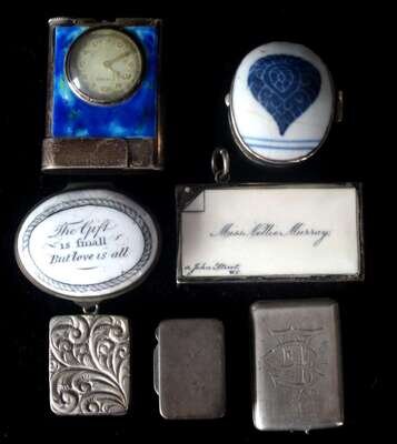 Four rectangular for pills, match safe, oval patch box with inscription, "The gift is small but love is all," oval porcelain pill box and silver and enamel clock/ table cigarette lighter.