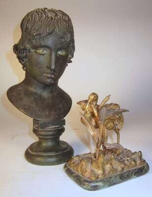 Bronze, gilt patina, modeled catching a toad in its beak, in a naturalistc setting raised on a rounded square green marble base. Together with bronze bust of a classical young man. (2).