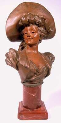 Spelter bust of a maiden, signed "van der Straeten", raised on red marble pedestal.