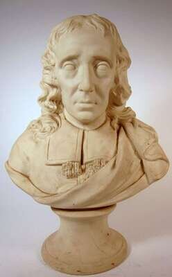 Modeled as a long-haired friar with protruding brow and sunken eyes, wearing a long collar and a cloth draped over his left shoulder.