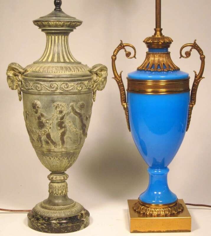 Flanked with gilt metal scrolling handles, raised on square base; together with a Neoclassical verdigris cast metal urn, both converted to lamps. (2).